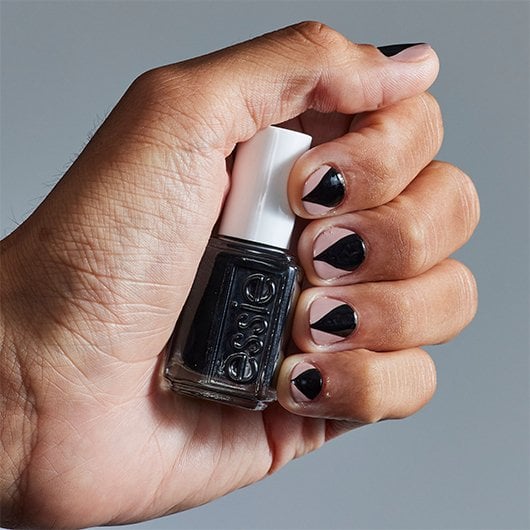 step 2. make moon-shaped ascents: use 'licorice' and a fine detail brush to paint a small smile line, tracing the moon of each nail. fill in the rest of the nail from the line to the tip with 'licorice,' creating an empty moon manicure.