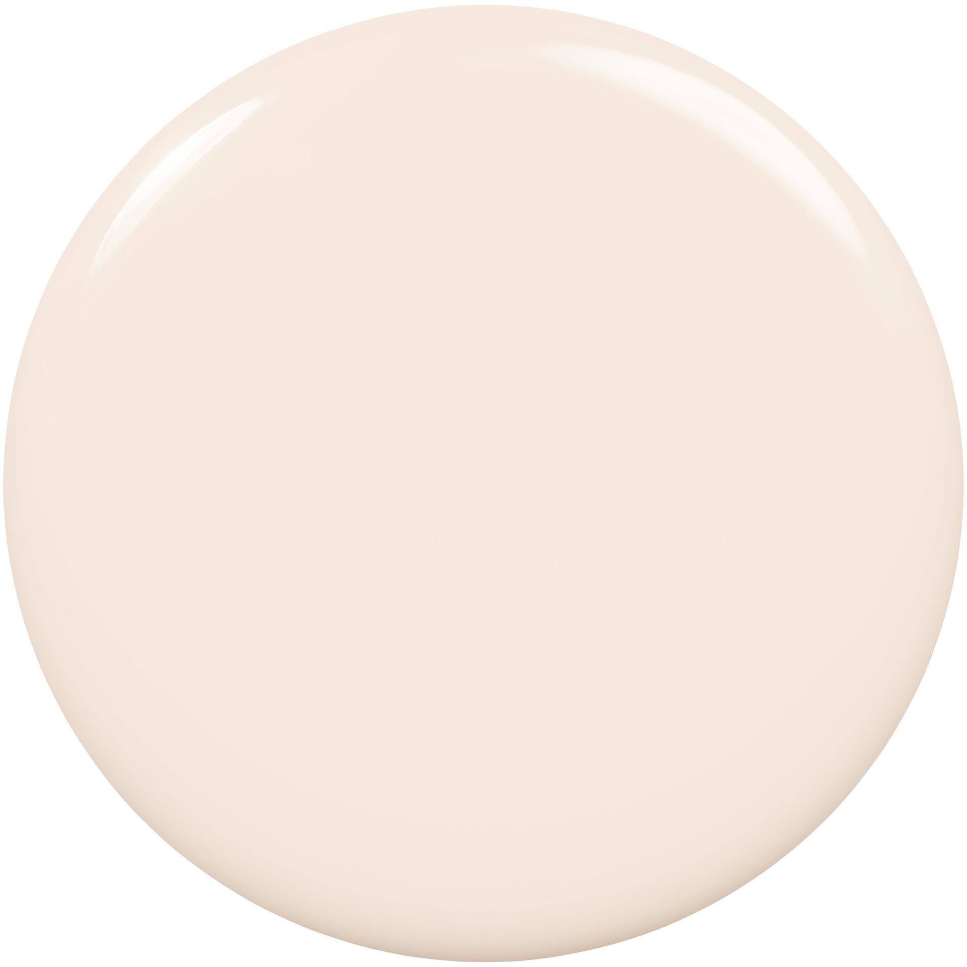 A dirty eggshell white quick dry nail polish with yellow undertones and a full coverage gloss finish